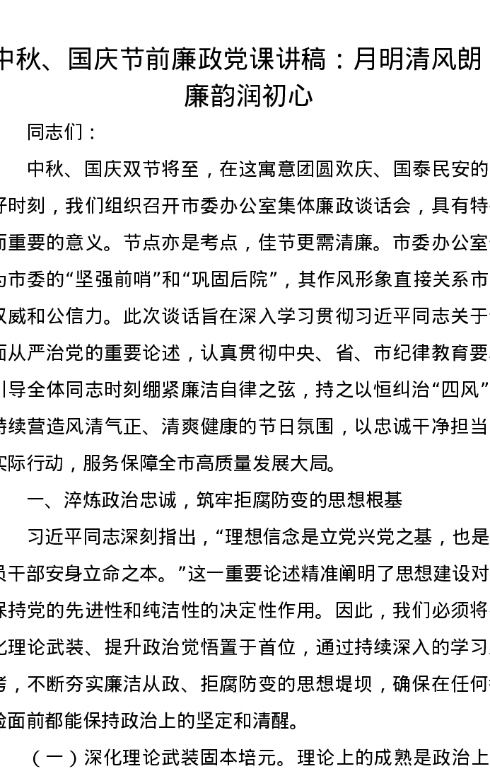 中秋、国庆节前廉政党课讲稿:月明清风朗,廉韵润初心