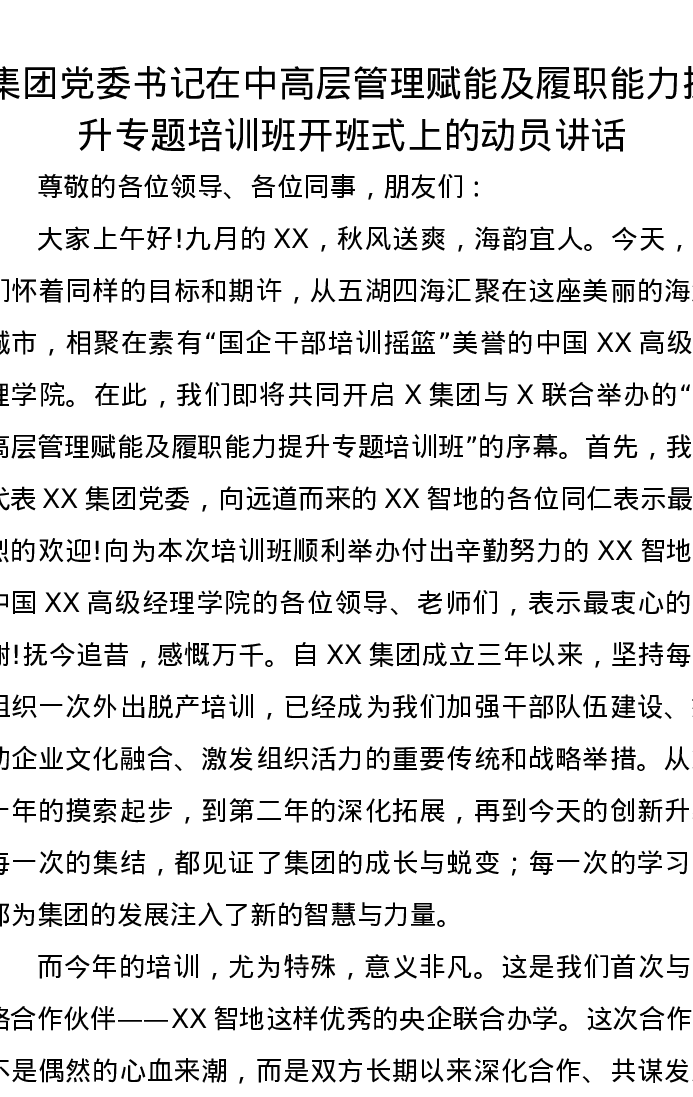 集团党委书记在中高层管理赋能及履职能力提升专题培训班开班式上的动员讲话