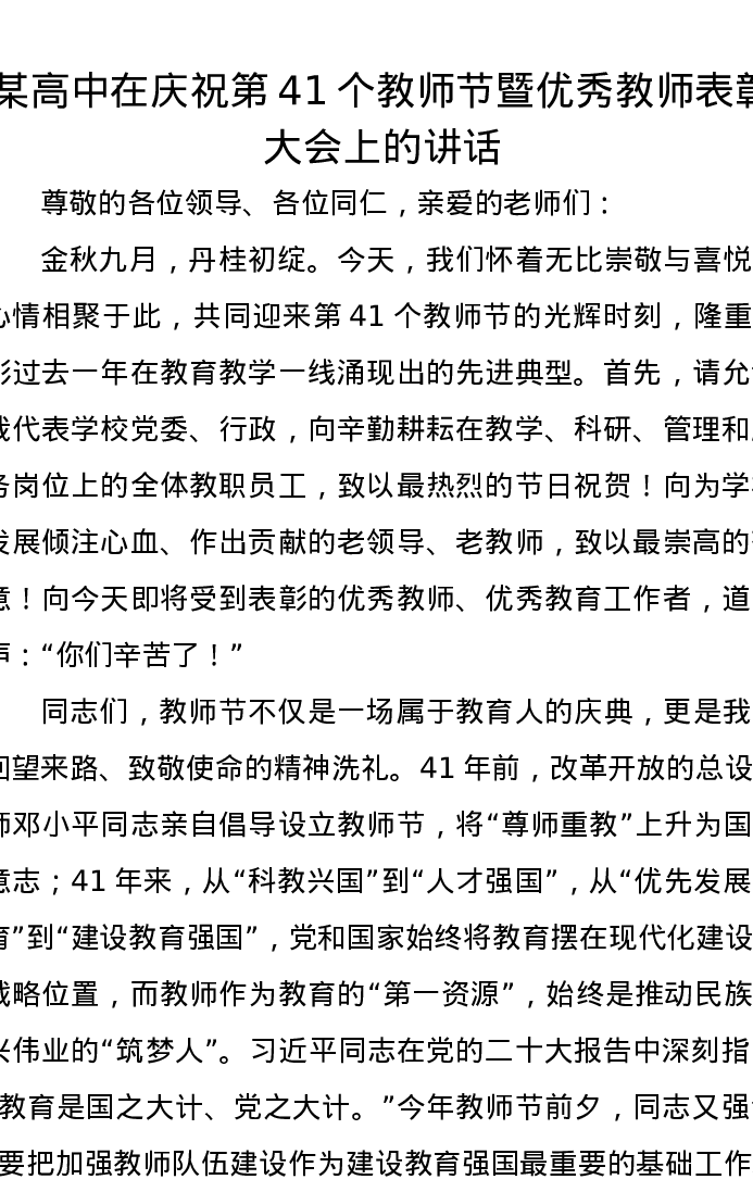 某高中在庆祝第41个教师节暨优秀教师表彰大会上的讲话