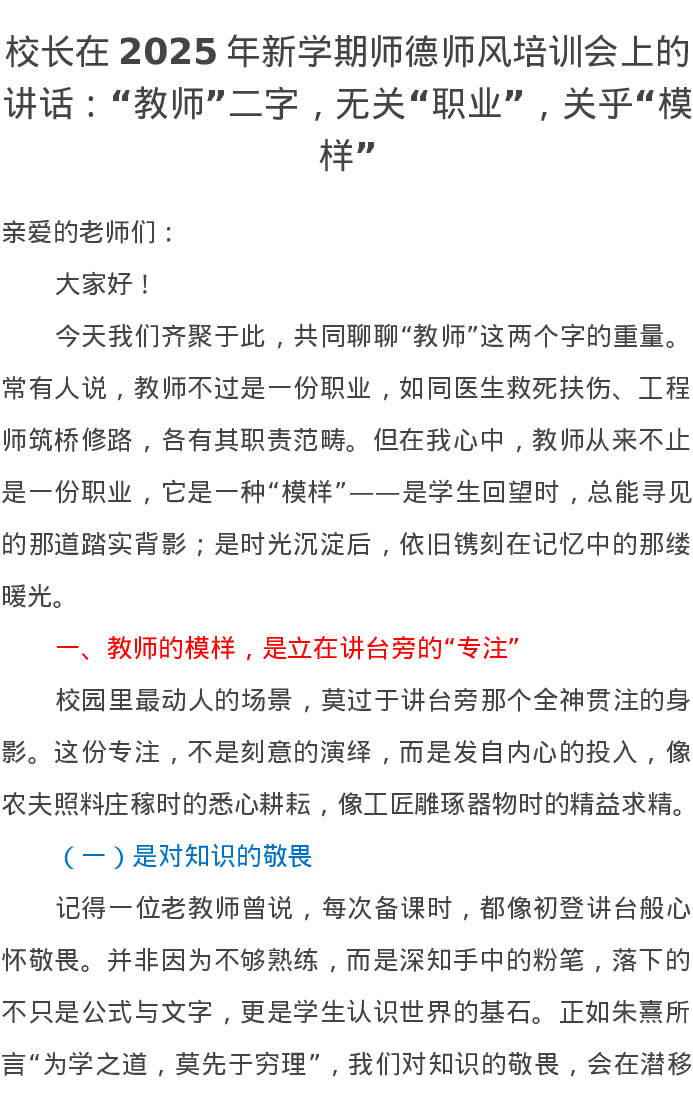 校长在2025年新学期师德师风培训会上的讲话:“教师”二字,无关“职业”,关乎“模样”