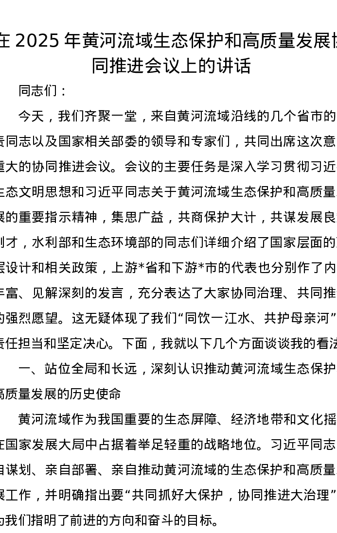 在2025年黄河流域生态保护和高质量发展协同推进会议上的讲话