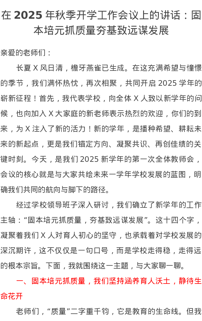 在2025年秋季开学工作会议上的讲话:固本培元抓质量夯基致远谋发展