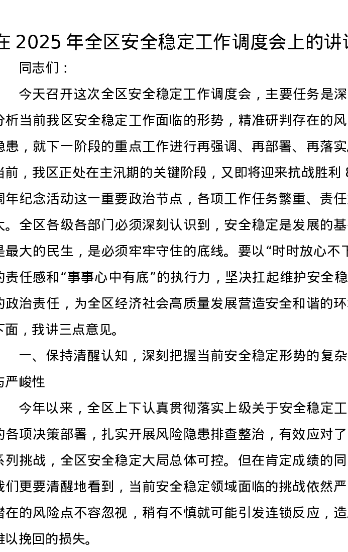 在2025年全区安全稳定工作调度会上的讲话