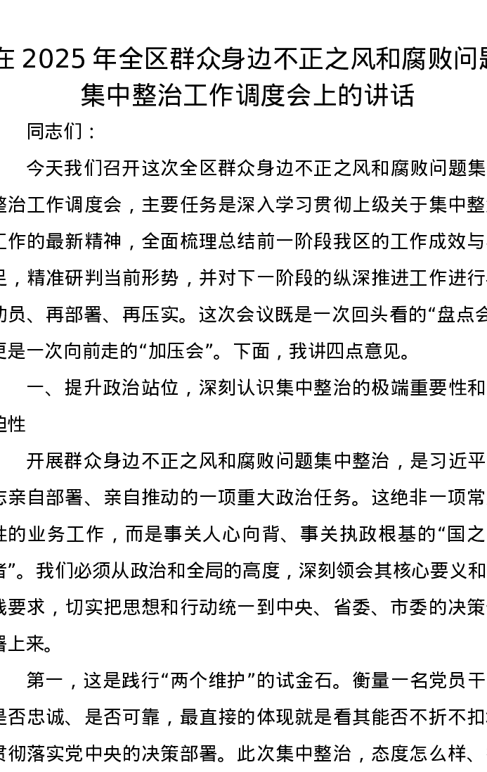 在2025年全区群众身边不正之风和腐败问题集中整治工作调度会上的讲话