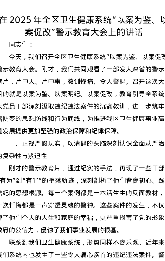 在2025年全区卫生健康系统“以案为鉴、以案促改”警示教育大会上的讲话