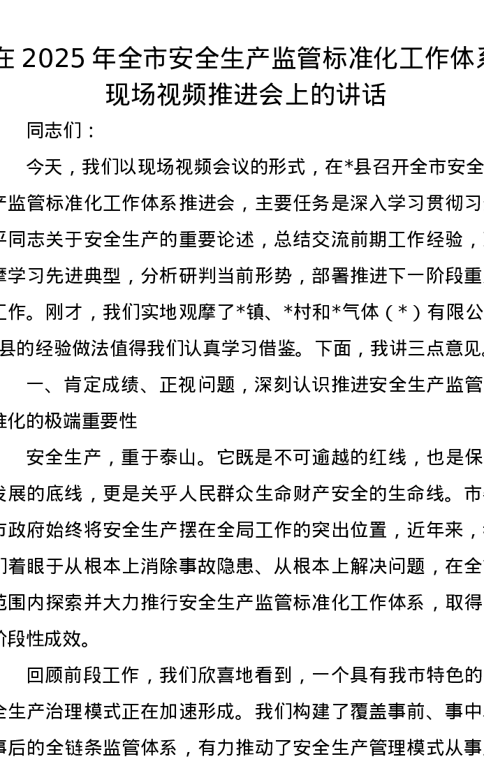 在2025年全市安全生产监管标准化工作体系现场视频推进会上的讲话