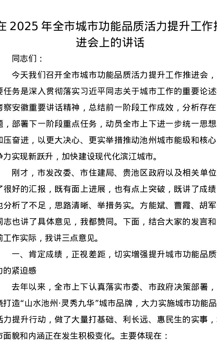 在2025年全市城市功能品质活力提升工作推进会上的讲话