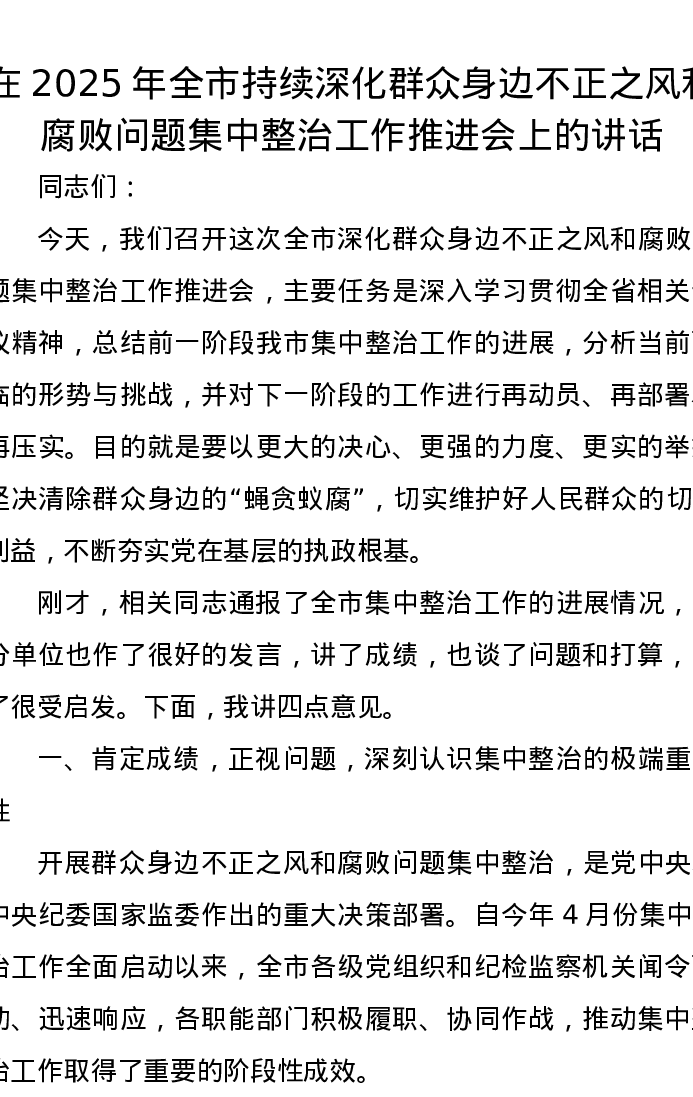 在2025年全市持续深化群众身边不正之风和腐败问题集中整治工作推进会上的讲话