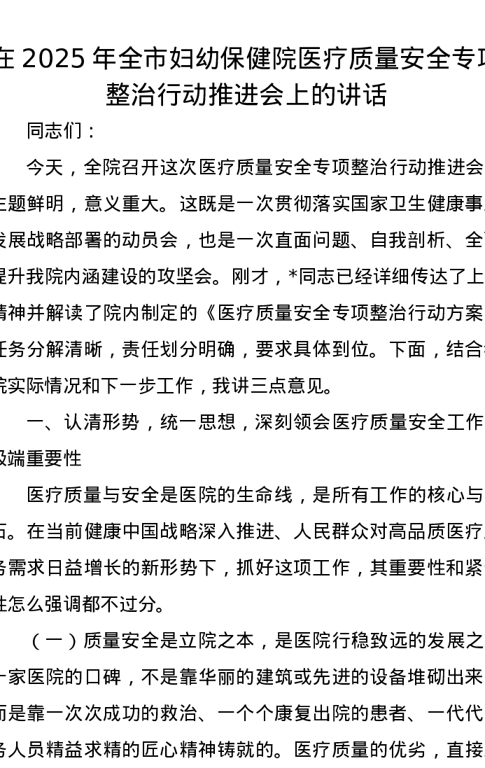 在2025年全市妇幼保健院医疗质量安全专项整治行动推进会上的讲话