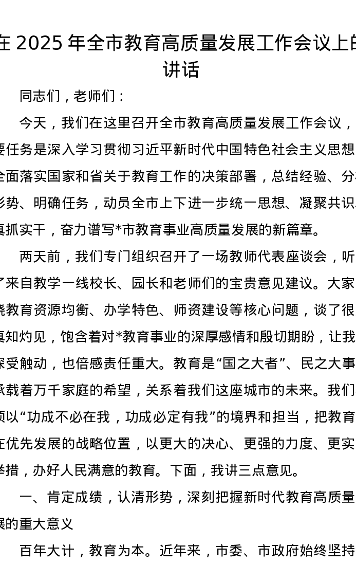 在2025年全市教育高质量发展工作会议上的讲话