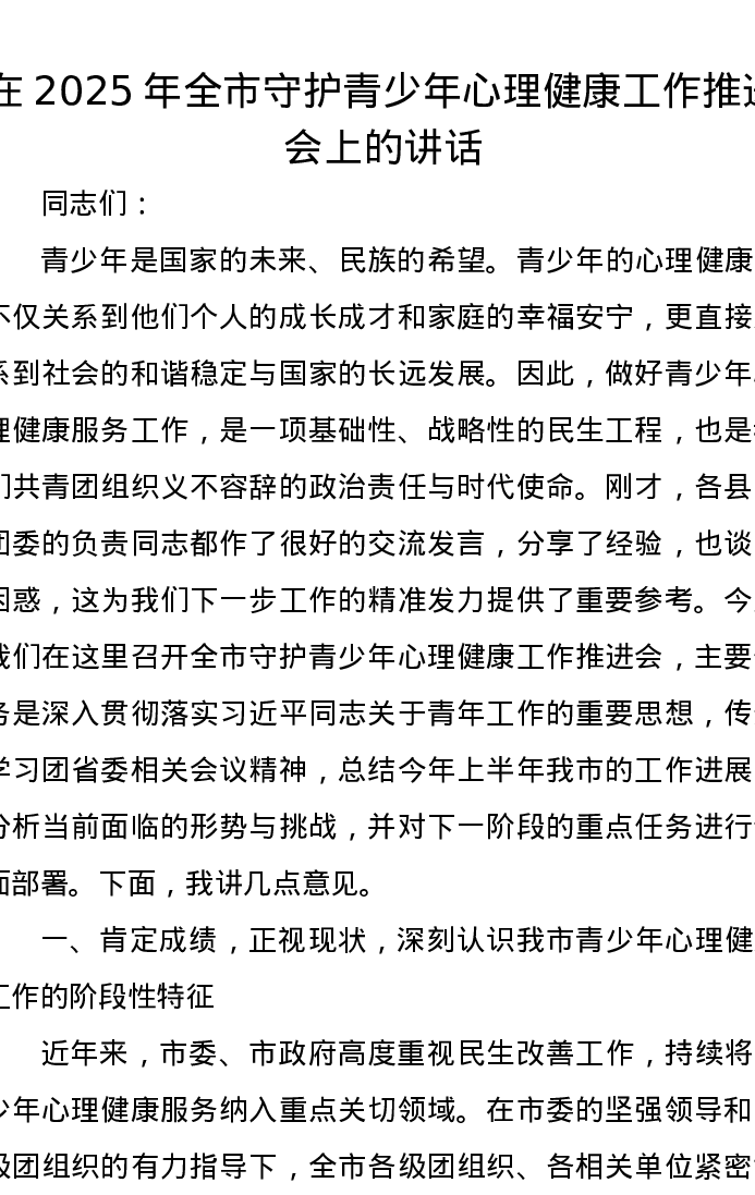 在2025年全市守护青少年心理健康工作推进会上的讲话