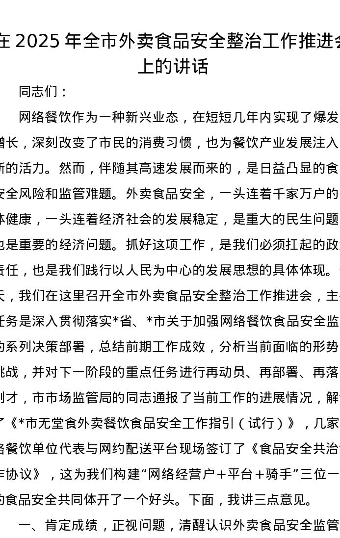 在2025年全市外卖食品安全整治工作推进会上的讲话