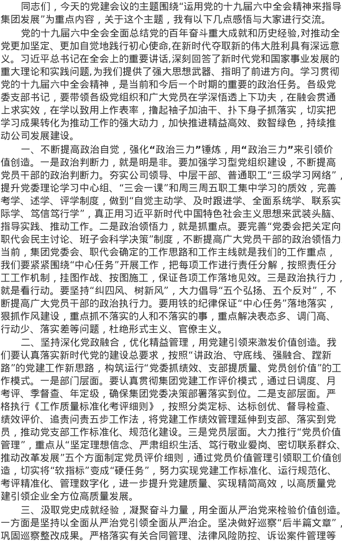 20220322运用党的十九届六中全会精神来指导集团发展(国企党委书记在集团党建工作会议上的讲话)
