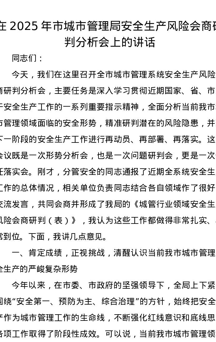 在2025年市城市管理局安全生产风险会商研判分析会上的讲话