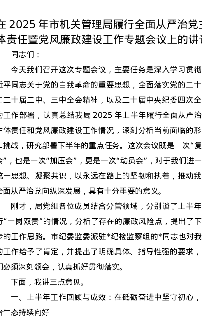 在2025年市机关管理局履行全面从严治党主体责任暨党风廉政建设工作专题会议上的讲话