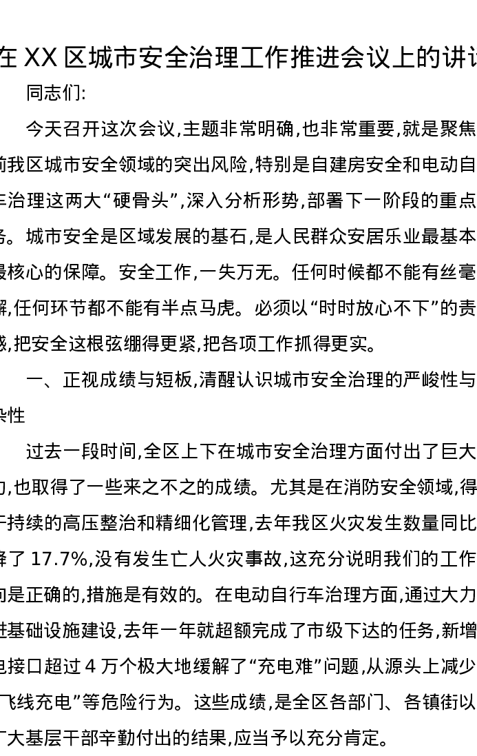 在XX区城市安全治理工作推进会议上的讲话