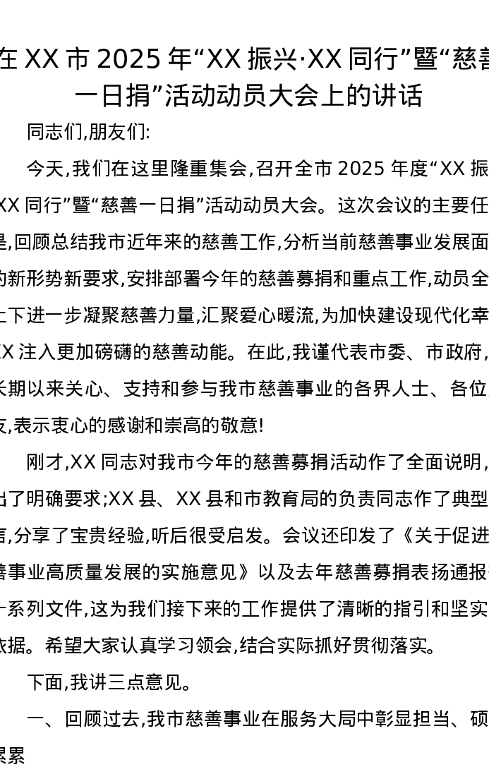 在XX市2025年“XX振兴·XX同行”暨“慈善一日捐”活动动员大会上的讲话