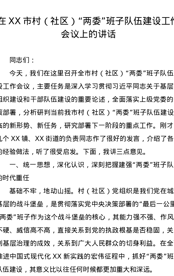 在XX市村(社区)“两委”班子队伍建设工作会议上的讲话