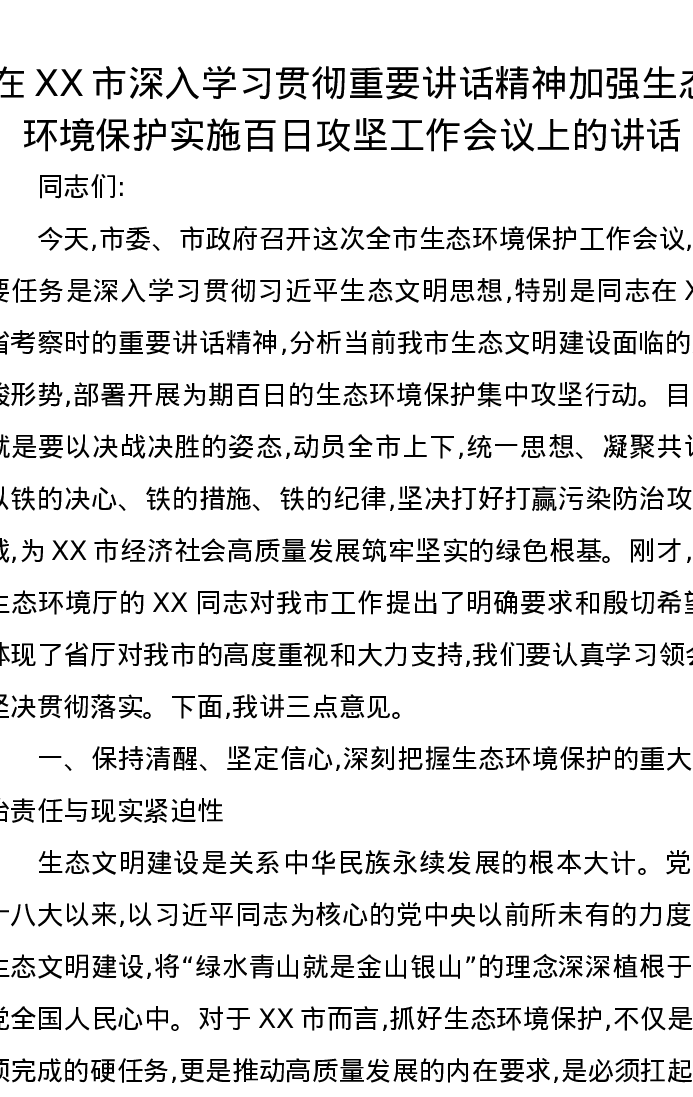 在XX市深入学习贯彻重要讲话精神加强生态环境保护实施百日攻坚工作会议上的讲话