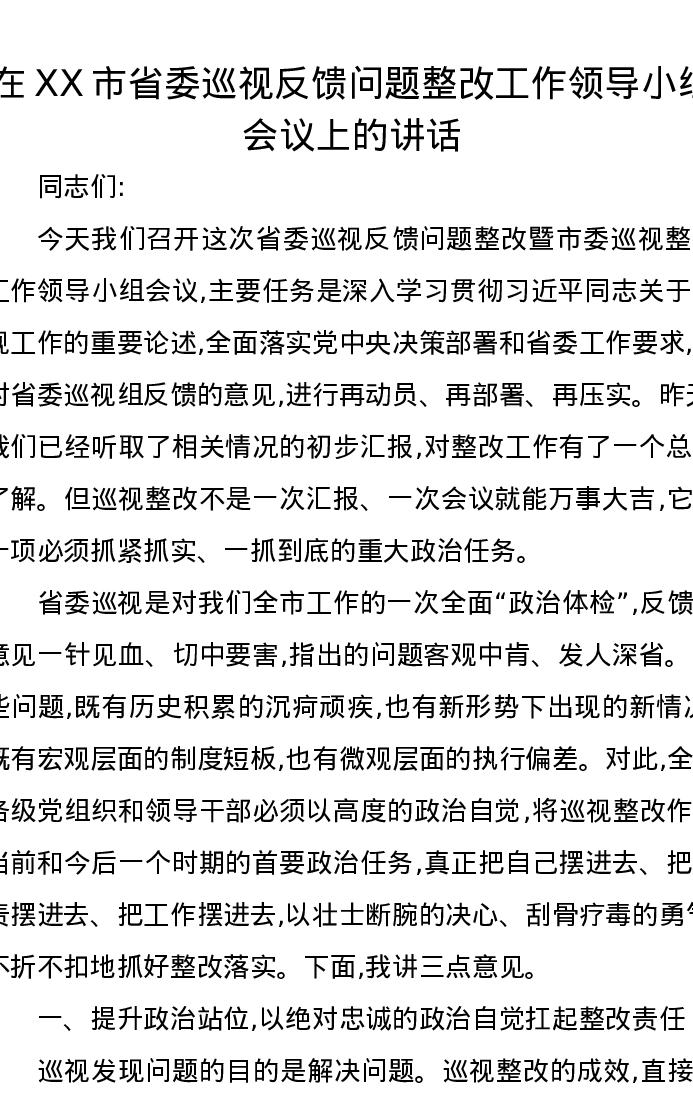 在XX市省委巡视反馈问题整改工作领导小组会议上的讲话