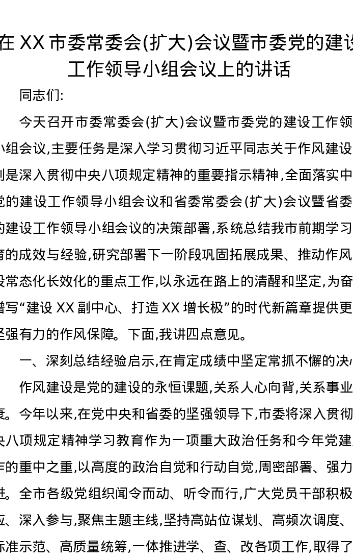 在XX市委常委会(扩大)会议暨市委党的建设工作领导小组会议上的讲话