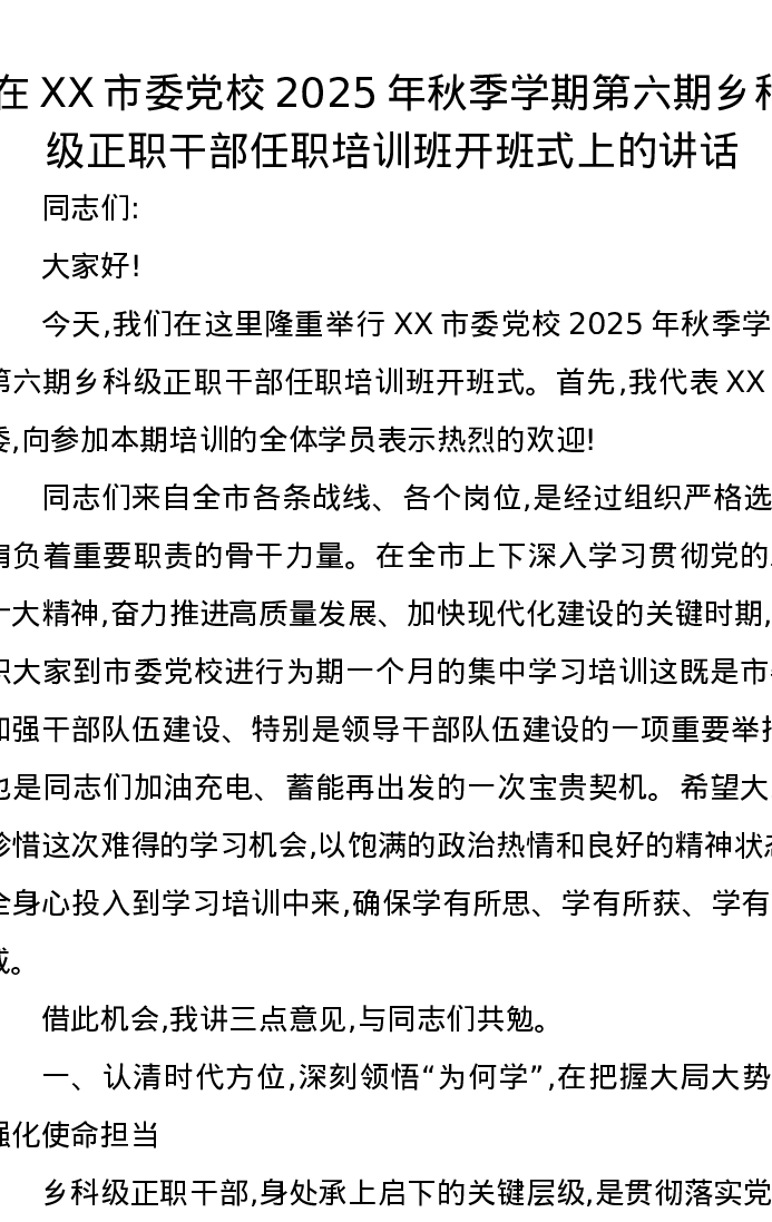 在XX市委党校2025年秋季学期第六期乡科级正职干部任职培训班开班式上的讲话