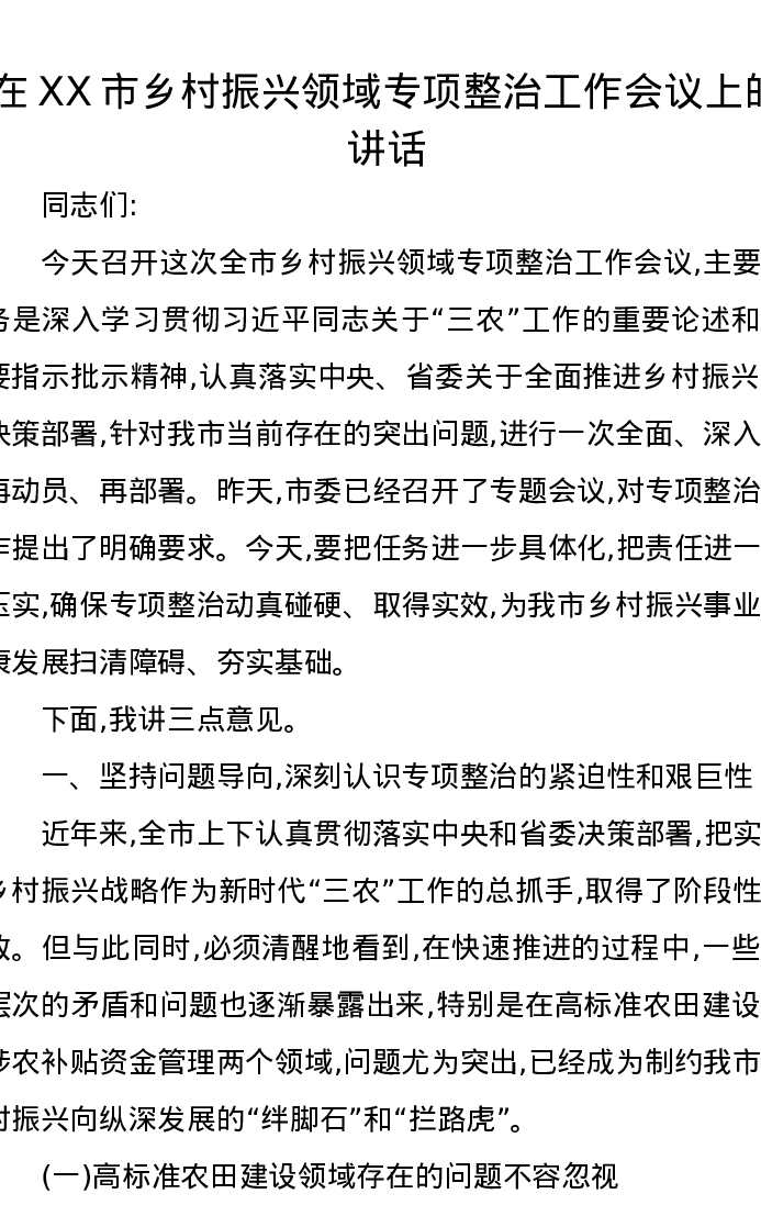 在XX市乡村振兴领域专项整治工作会议上的讲话