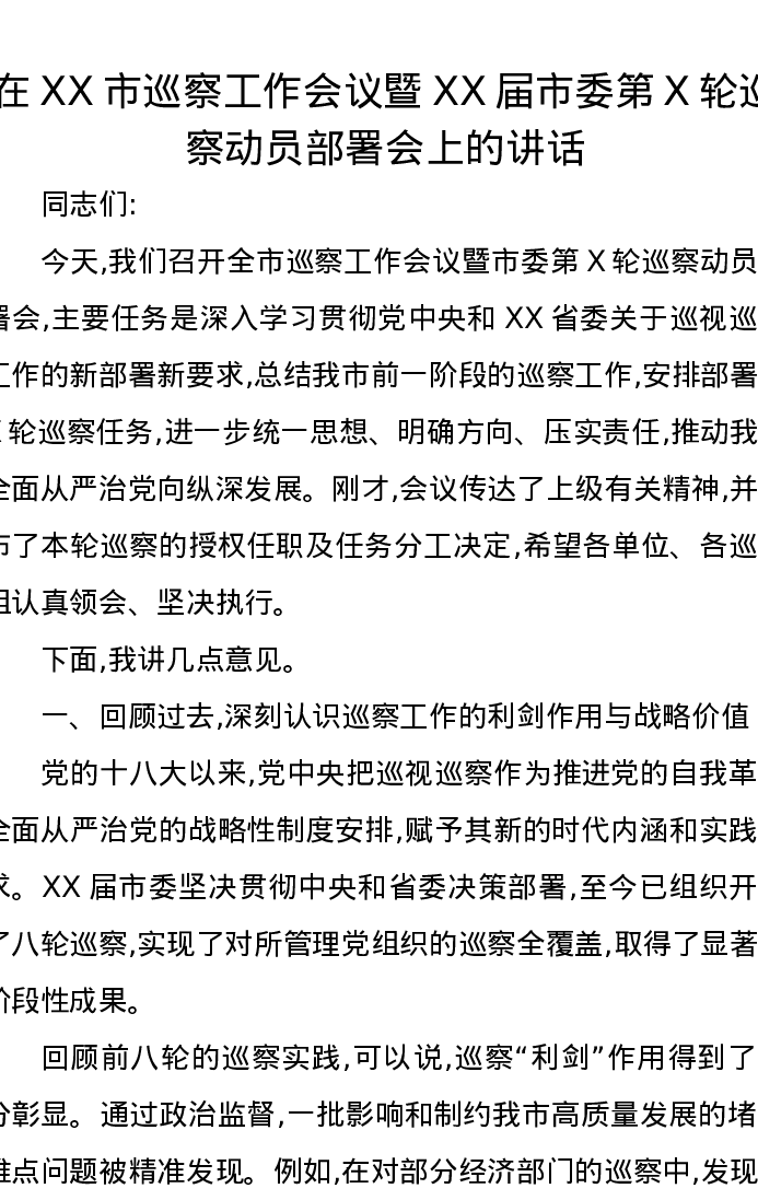 在XX市巡察工作会议暨XX届市委第X轮巡察动员部署会上的讲话