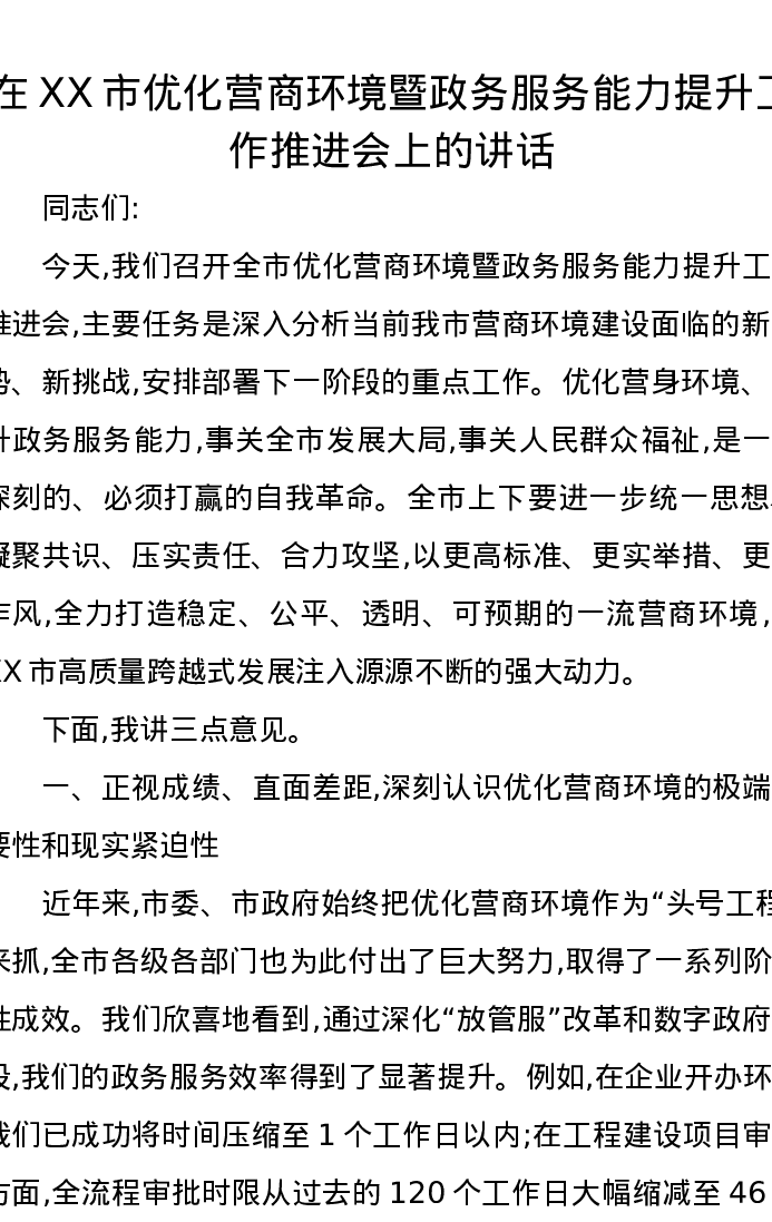 在XX市优化营商环境暨政务服务能力提升工作推进会上的讲话