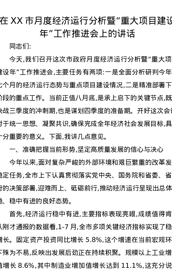 在XX市月度经济运行分析暨“重大项目建设年”工作推进会上的讲话