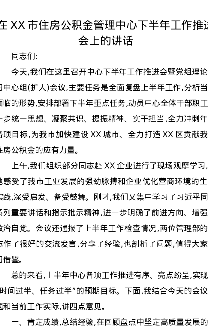 在XX市住房公积金管理中心下半年工作推进会上的讲话
