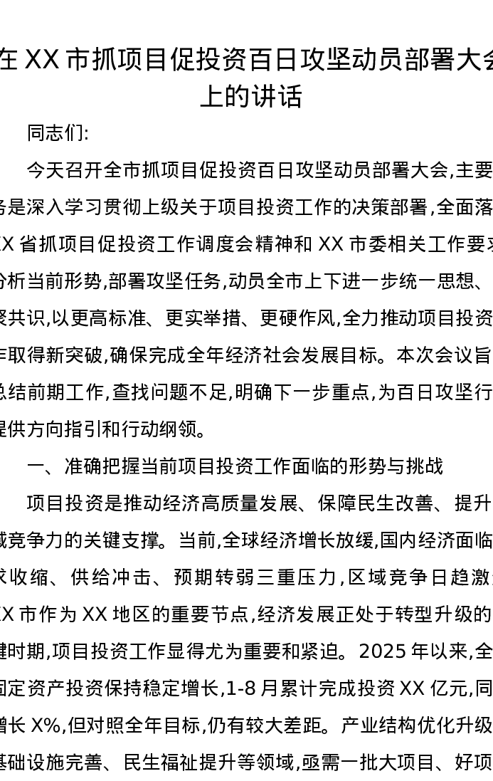 在XX市抓项目促投资百日攻坚动员部署大会上的讲话