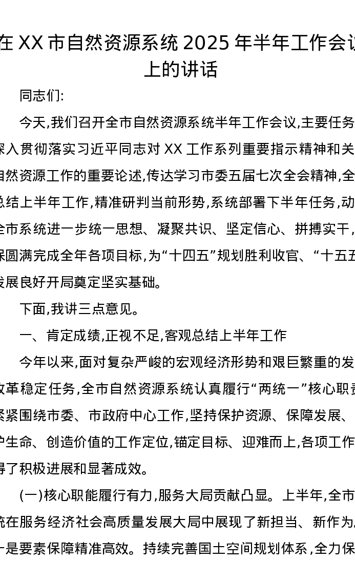 在XX市自然资源系统2025年半年工作会议上的讲话