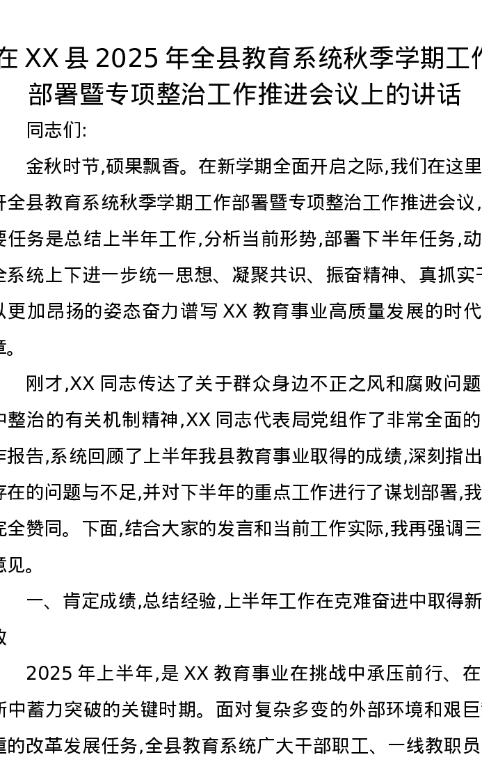在XX县2025年全县教育系统秋季学期工作部署暨专项整治工作推进会议上的讲话
