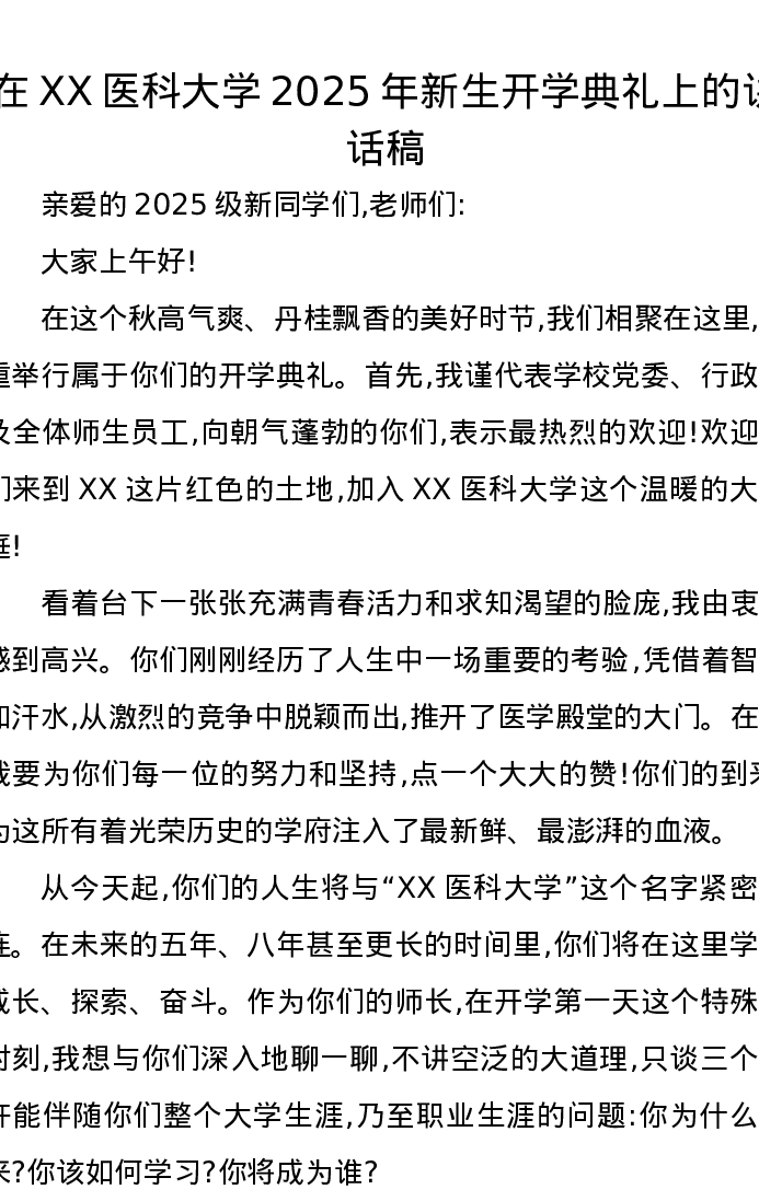 在XX医科大学2025年新生开学典礼上的讲话稿