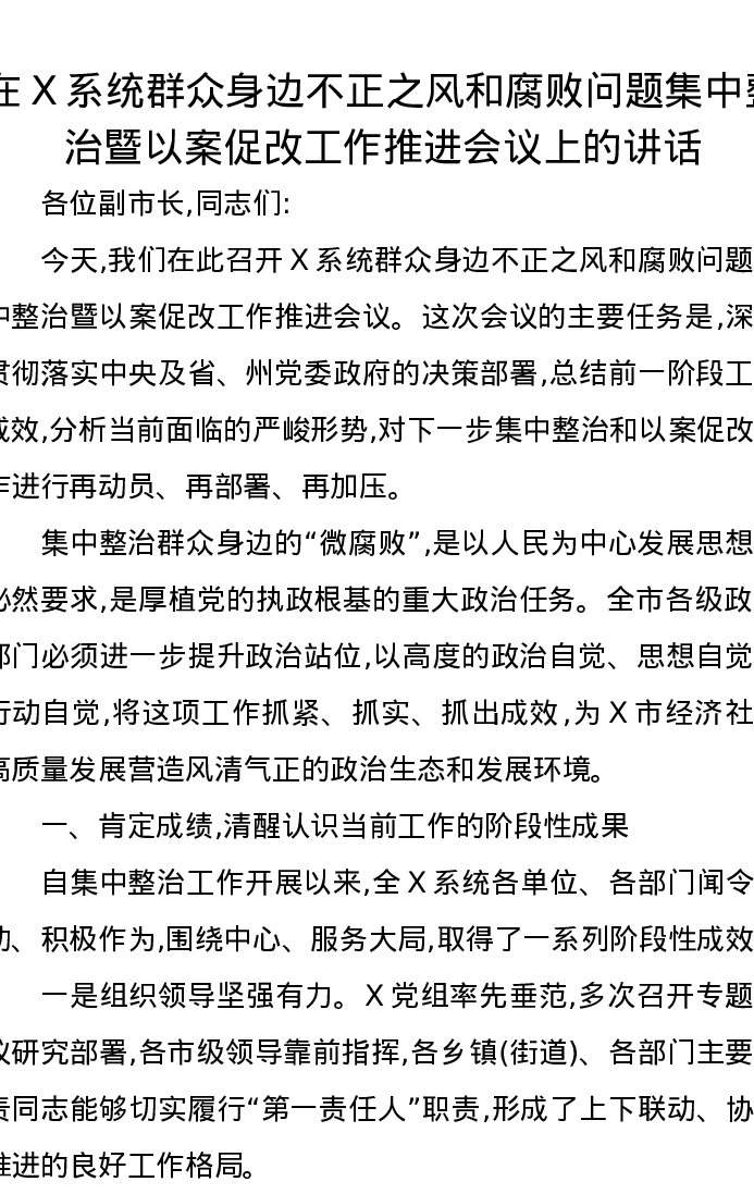 在X系统群众身边不正之风和腐败问题集中整治暨以案促改工作推进会议上的讲话