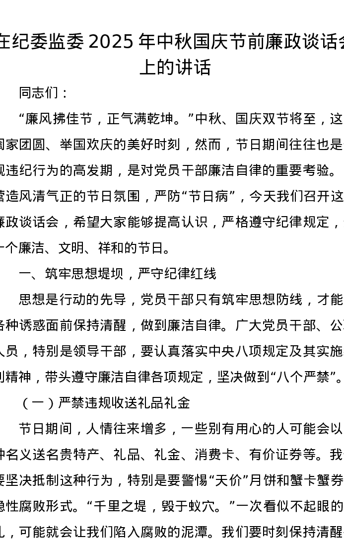 在纪委监委2025年中秋国庆节前廉政谈话会上的讲话