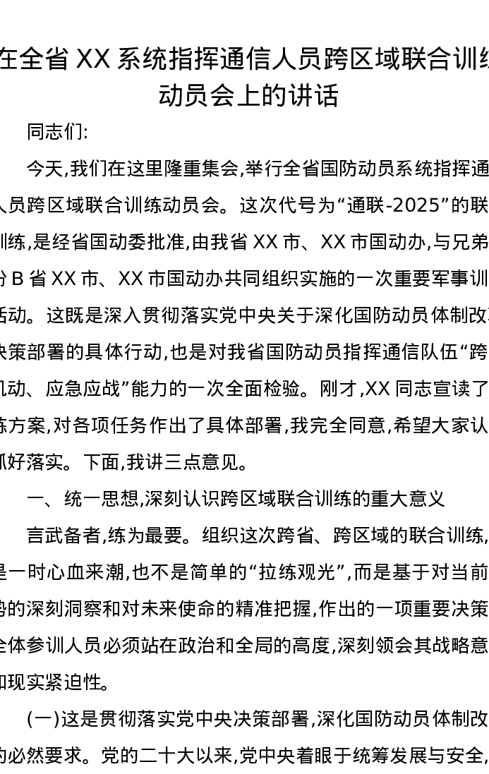 在全省XX系统指挥通信人员跨区域联合训练动员会上的讲话
