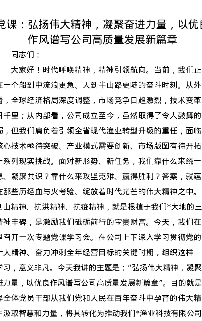 党课讲稿::弘扬伟大精神,凝聚奋进力量,以优良作风谱写公司高质量发展新篇章