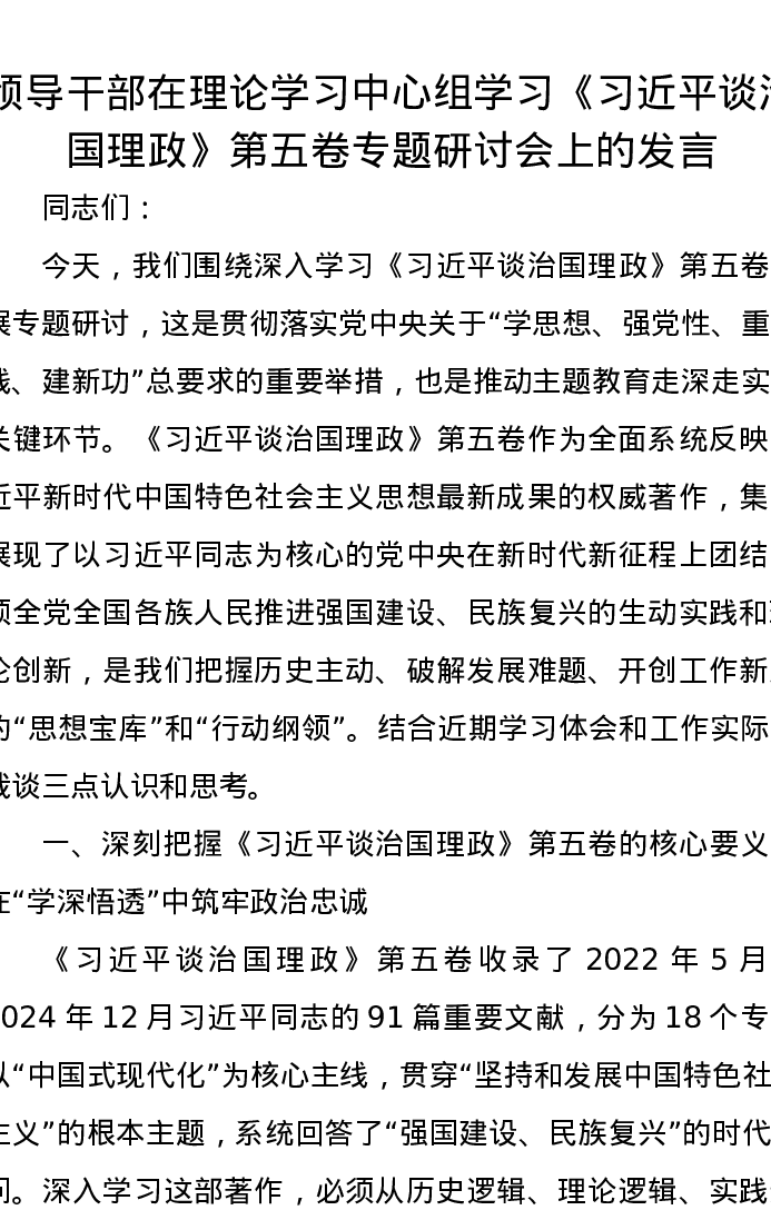 领导干部在理论学习中心组学习《习近平谈治国理政》第五卷专题研讨会上的发言