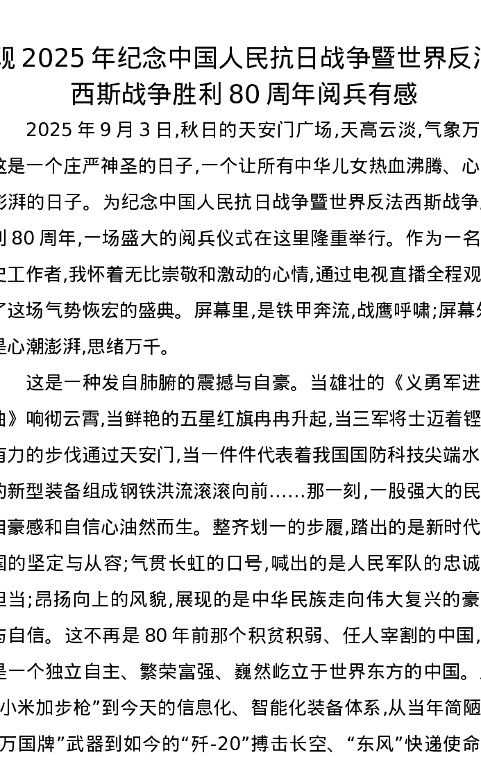 观2025年纪念中国人民抗日战争暨世界反法西斯战争胜利80周年阅兵有感