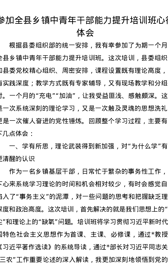 参加全县乡镇中青年干部能力提升培训班心得体会