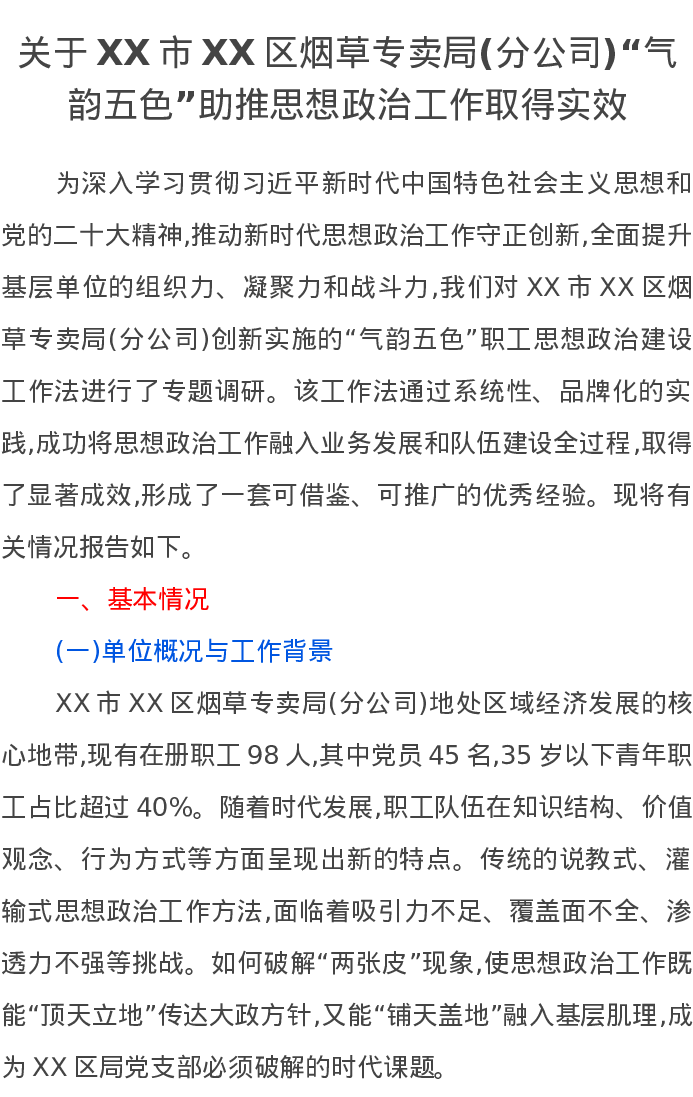 关于XX市XX区烟草专卖局(分公司)“气韵五色”助推思想政治工作取得实效