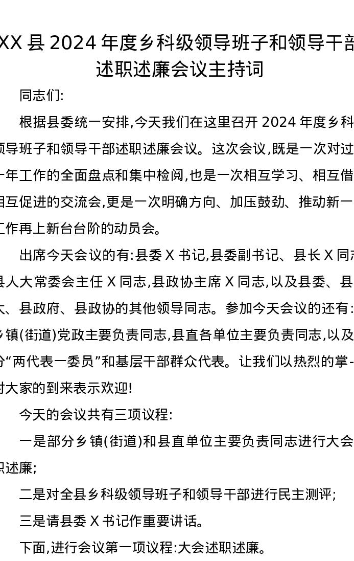 XX县2024年度乡科级领导班子和领导干部述职述廉会议主持词