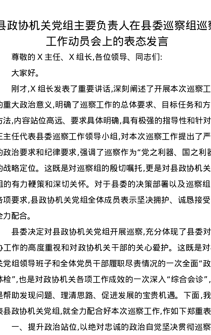 县政协机关党组主要负责人在县委巡察组巡察工作动员会上的表态发言