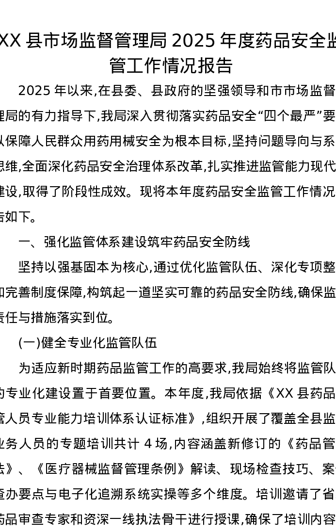 XX县市场监督管理局2025年度药品安全监管工作情况报告