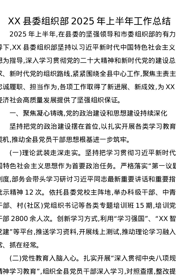 XX县委组织部2025年上半年工作总结