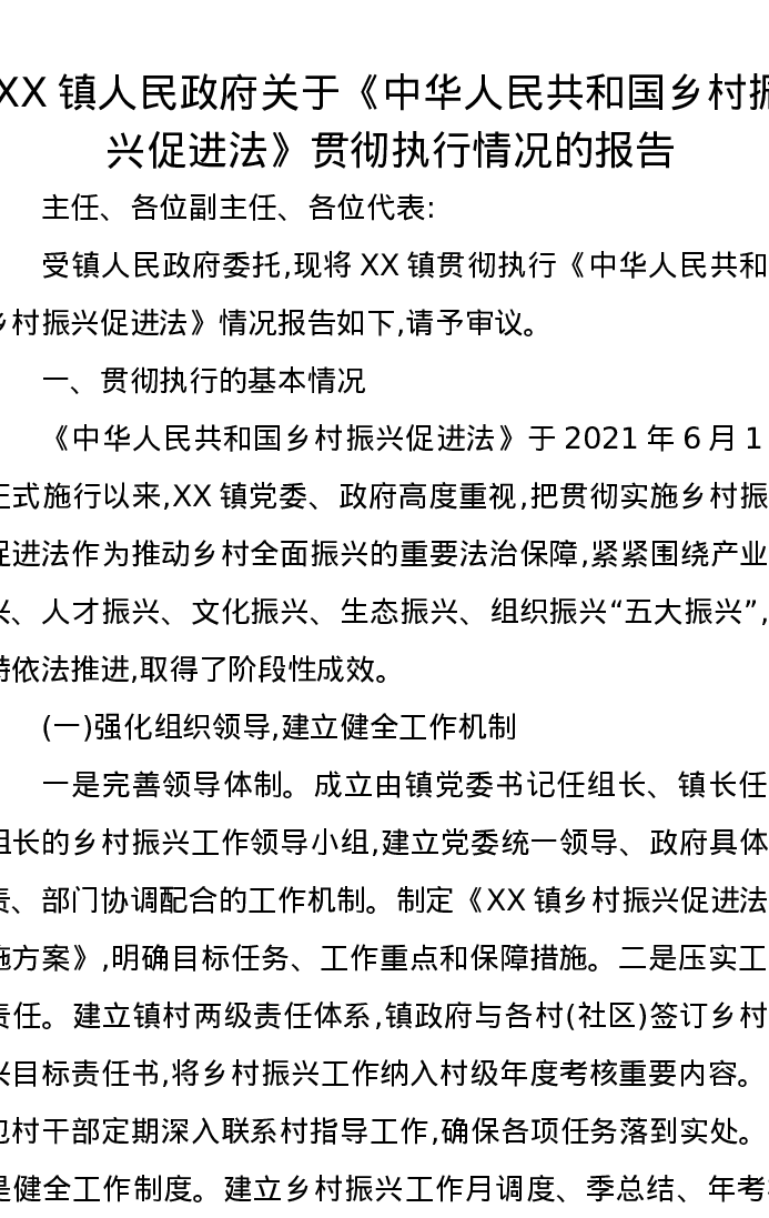 XX镇人民政府关于《中华人民共和国乡村振兴促进法》贯彻执行情况的报告
