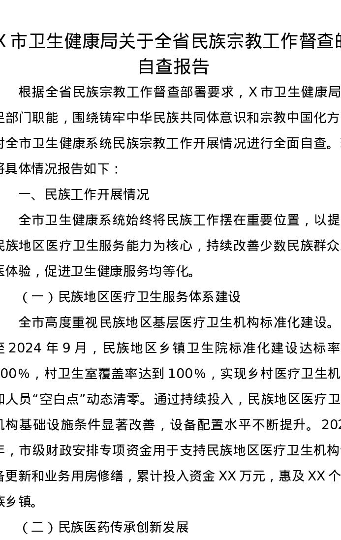 X市卫生健康局关于全省民族宗教工作督查的自查报告