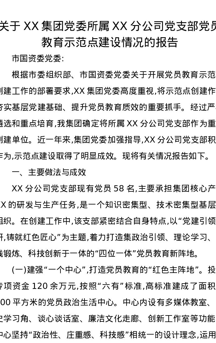关于XX集团党委所属XX分公司党支部党员教育示范点建设情况的报告